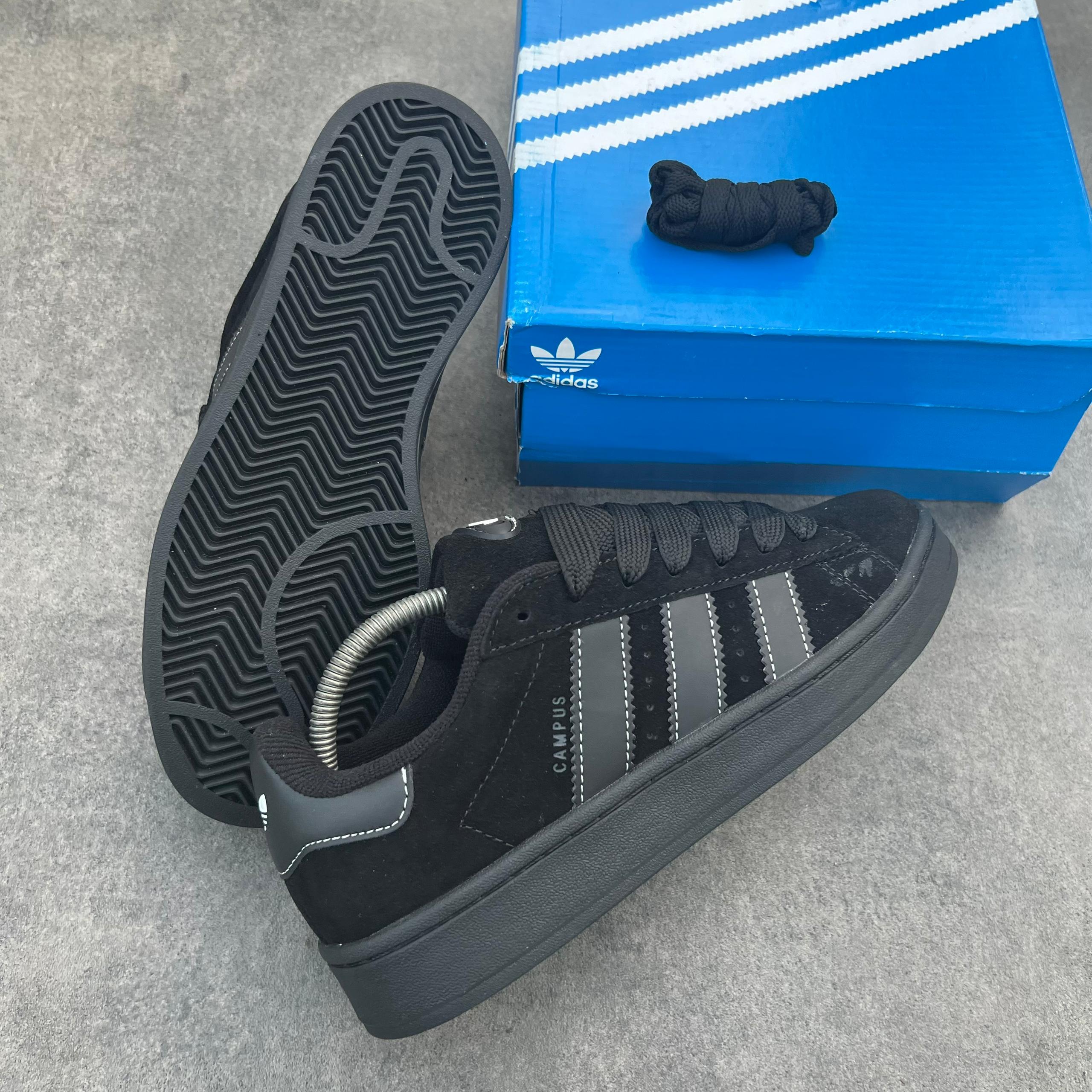 The Adidas Campus Triple Black is a sleek, monochromatic version of the iconic Campus silhouette, often seen in the popular chunky Campus 00s style, featuring an entirely black premium suede or leather upper, textile lining, padded tongue, and durable rubber outsole, offering a modern, skate-inspired look with classic comfort and minimalist street style, though some variations might have slight off-white accents for contrast.