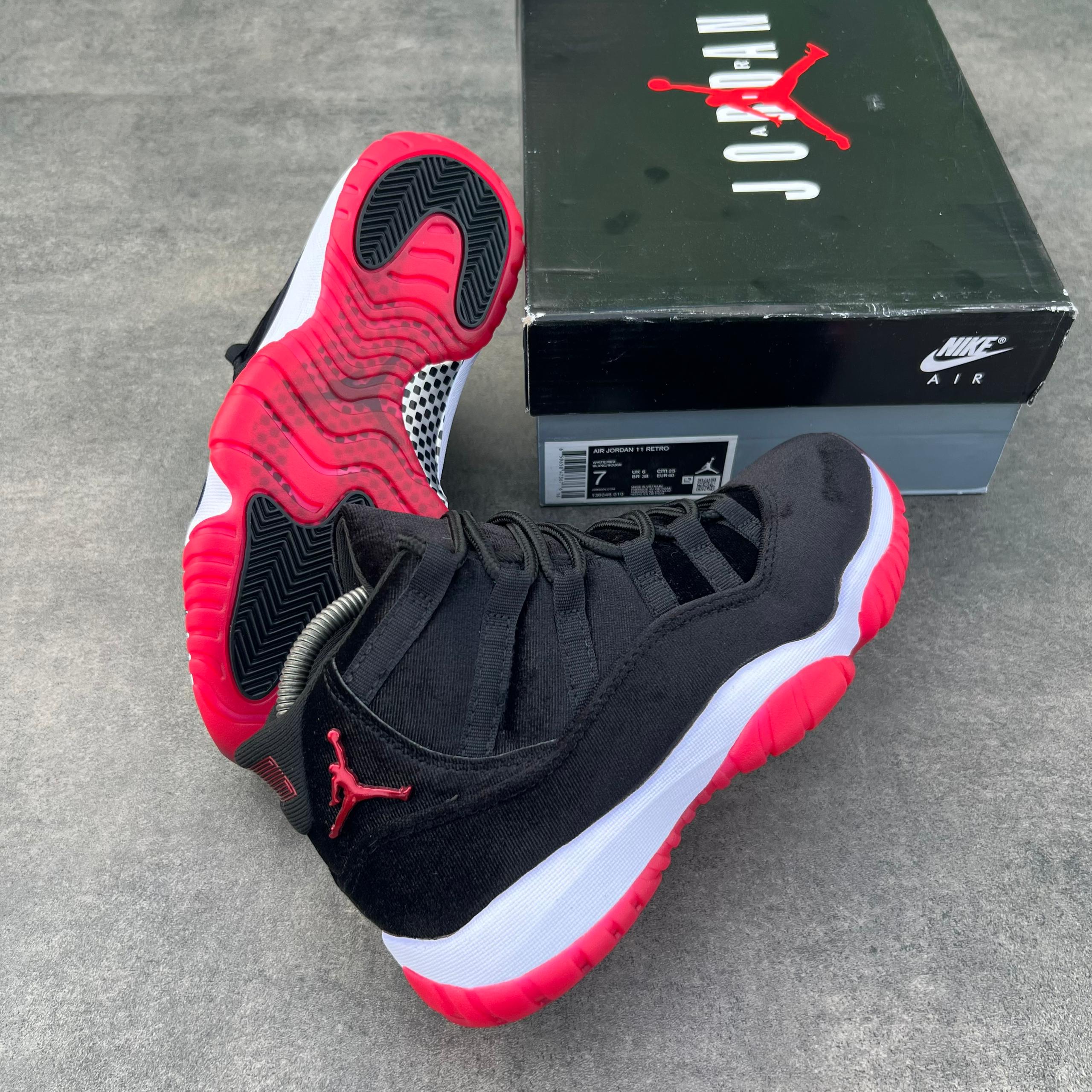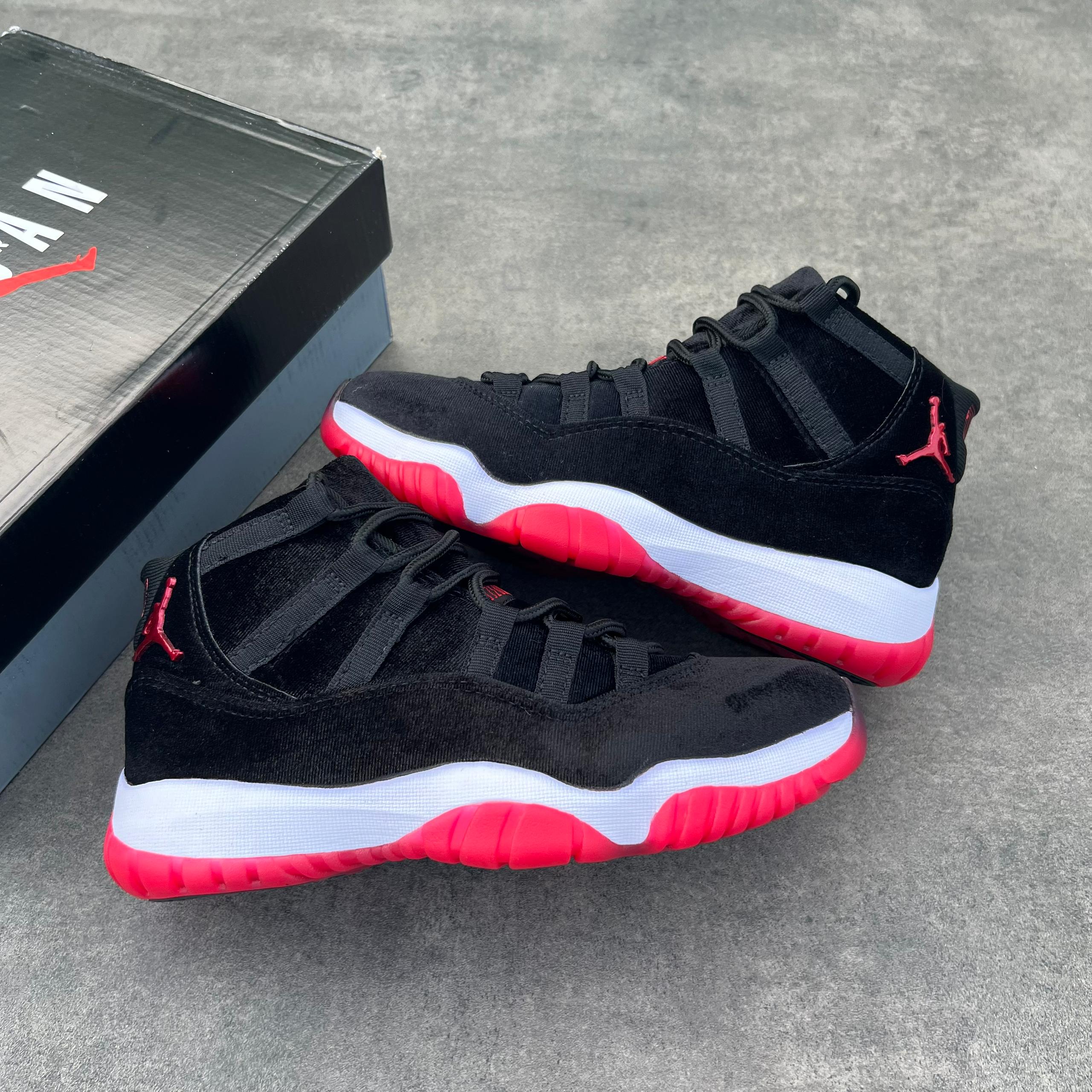 The Air Jordan 11 Retro “Bred Velvet” is a luxurious, women’s-exclusive take on the classic “Bred” colorway, replacing traditional materials with plush black velvet for the upper, giving it a rich texture and appearance. It keeps the iconic design with a white midsole, red semi-translucent outsole, and red Jumpman branding, but adds premium details like metallic red lace tips and a metallic “23” on the heel, offering a high-end, elegant feel for a beloved sneaker.